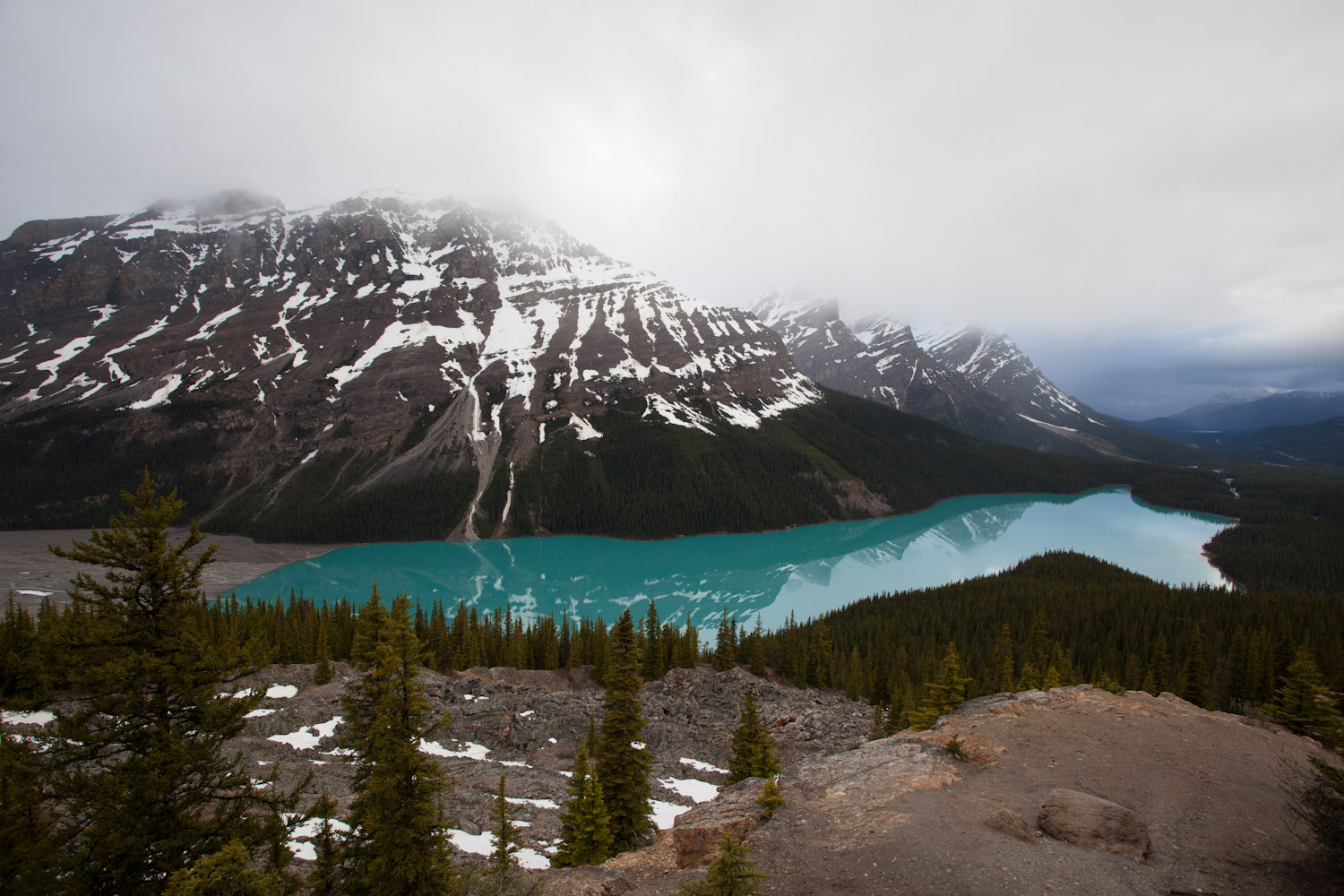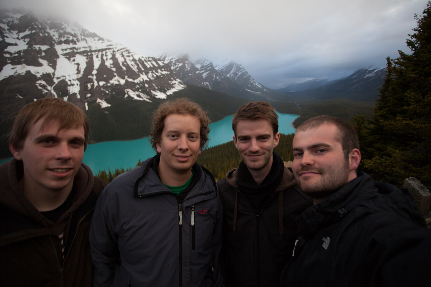 Dan denkt ge dat de dag er ongeveer op zit en dat we nog efkes de avondetappe van 125km moeten afleggen. Maar onder de baan stopten we aan een, naar mijn mening, ongelooflijk schoon spel: Lake Peyto (red: fixed the name). Schrijft da maar op voor als ge zelf eens naar Canada komt, da zou ge zeker moeten zien. Het meer is prachtig groen en weerspiegelt de bergen (voor zolang het niet regent). Jaja, de moeite!