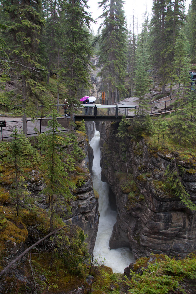 Zoals de voorbije dagen begon ook deze dag vrij somber: grijze dikke wolken en van die triestige regen. Maar we lieten ons nie kennen en gingen gewoon door zoals gepland. Eerste stop: Maligne Canyon. Onze beste K-Ways bovengehaald en een kort toerke gewandeld. Onderhoudend, maar niets spectaculairs na de voorbije dagen, en zeker niet na wat er nog zou volgen de rest van de dag. Alleen, dat wist ik nog niet.