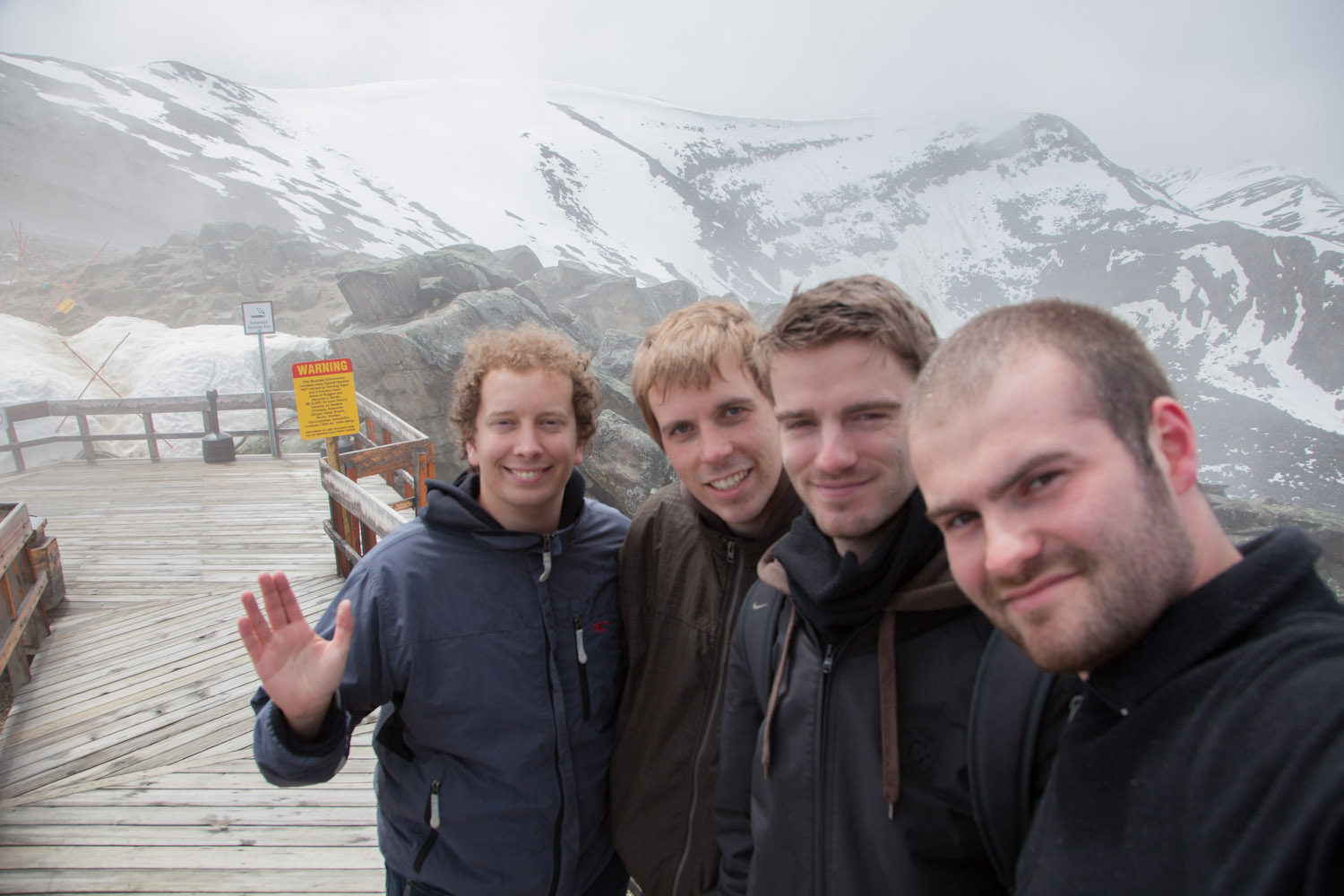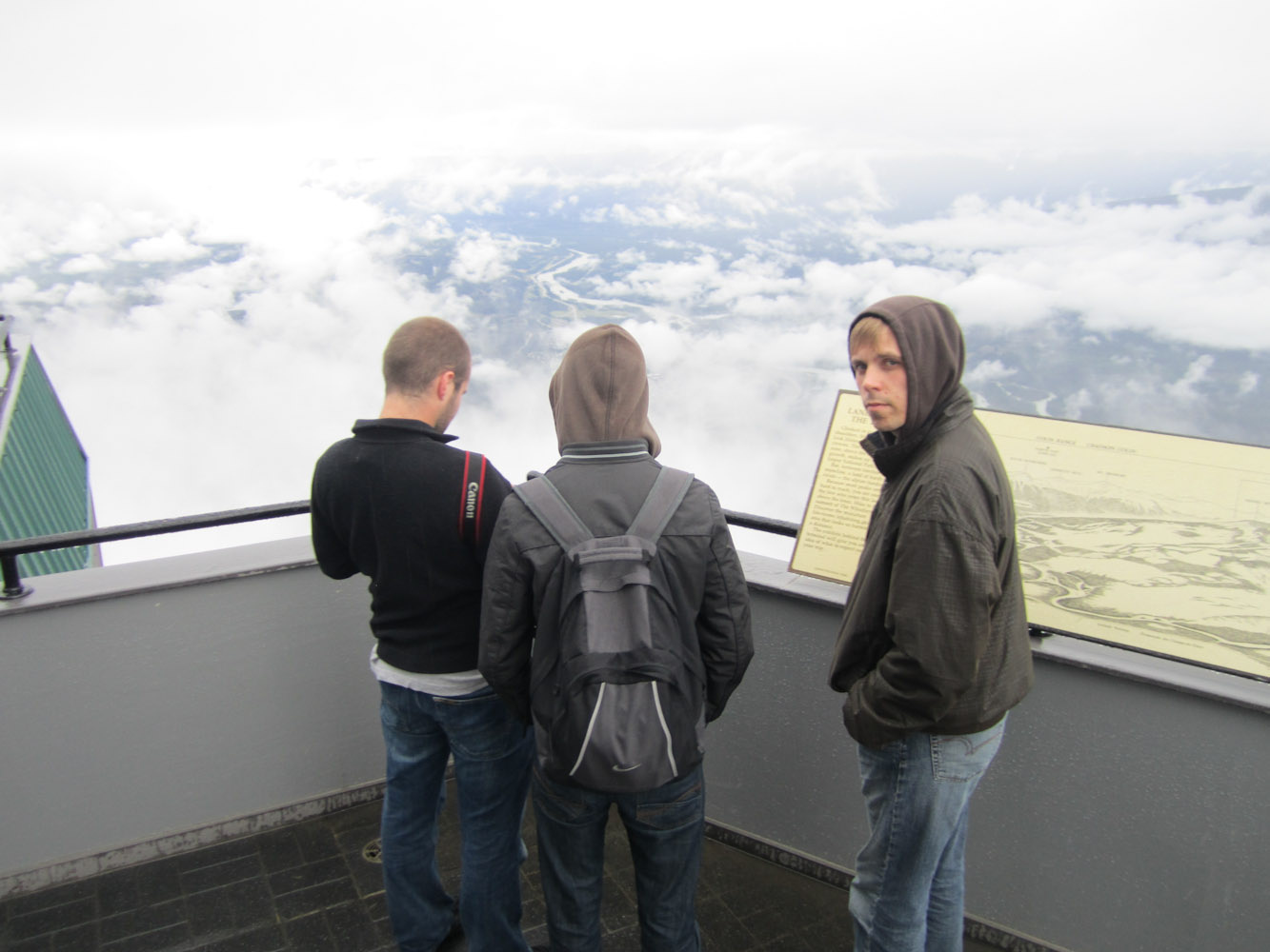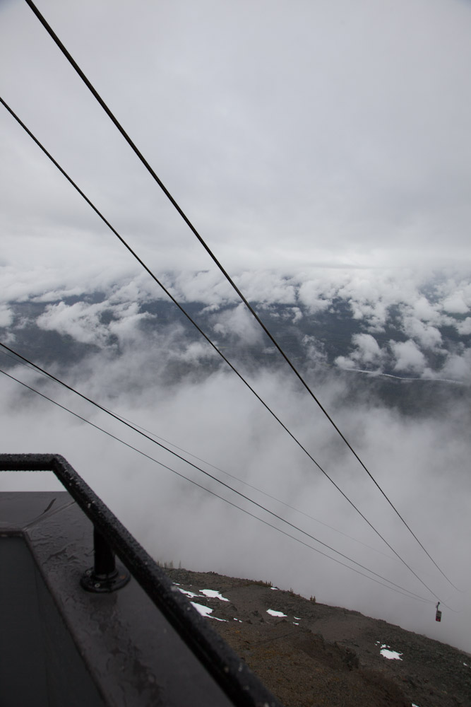 Een beetje verderop stond Jasper Tramway op de planning. Das een kabelbaanliftje dat u tot op 2250m brengt ongeveer. Volgens de kabelbaanliftbediende-kerel was ongeveer alles een neat little view. Vré duur om naar boven te mogen (31 flappen de man) en twas vrij mistig, dus ideaal was het zeker niet. Maar we zijn toch naar boven geweest en bij momenten had ge nog redelijk schoon zicht als er gaten kwamen in het mistdek. Kwas wel blij met mijn 4 lagen uitrusting en sjaal. Coppens had het iets frisser met zijn t-shirt en K-Way bij een goede 1°C (ah, kijk eens aan, op dit toetsenbord staat er wel een °-teken). De bijhorende picnic was bijgevolg niet de meest aangename die we al gehad hebben.