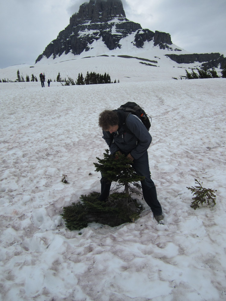 Eigenlijk toch wel zot eh. Vandaag doen we een wandeling tussen langlaufers, overmorgen zitten we mogelijks in een hot spring te genieten van het zonnetje. Tkan verkeren! De wandeling op zich was iets lastiger dan gedacht en eens aangekomen bij Hidden Lake bleek het Lake ook inderdaad Hidden te zijn. Tis te zeggen, het lag nog volledig bedekt met sneeuw, waardoor ge amper het meer kon onderscheiden van de rest van de sneeuwvlakte. Jammer. Maar in het terugkeren hebben Pieter en ik ons toch eens kunnen uitleven in de sneeuw en met een plastiekzak als slee.