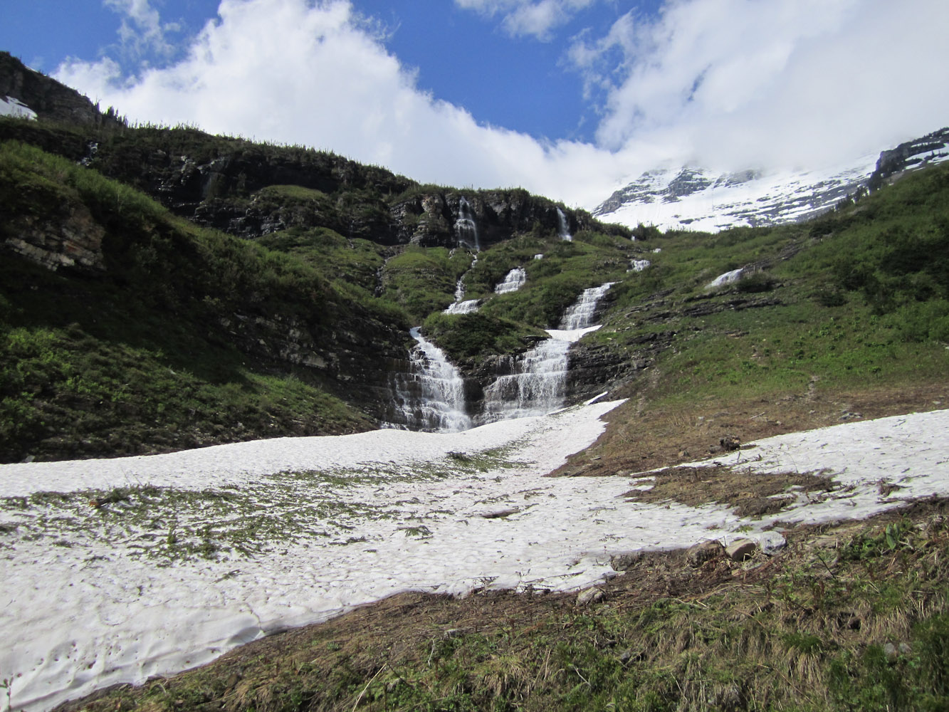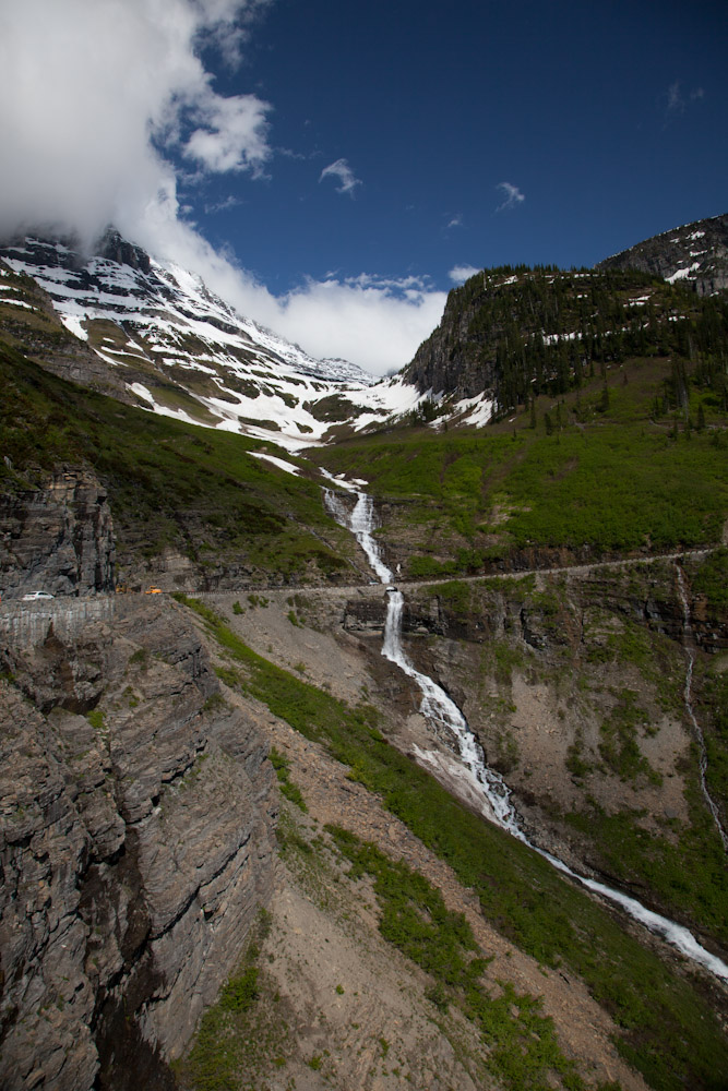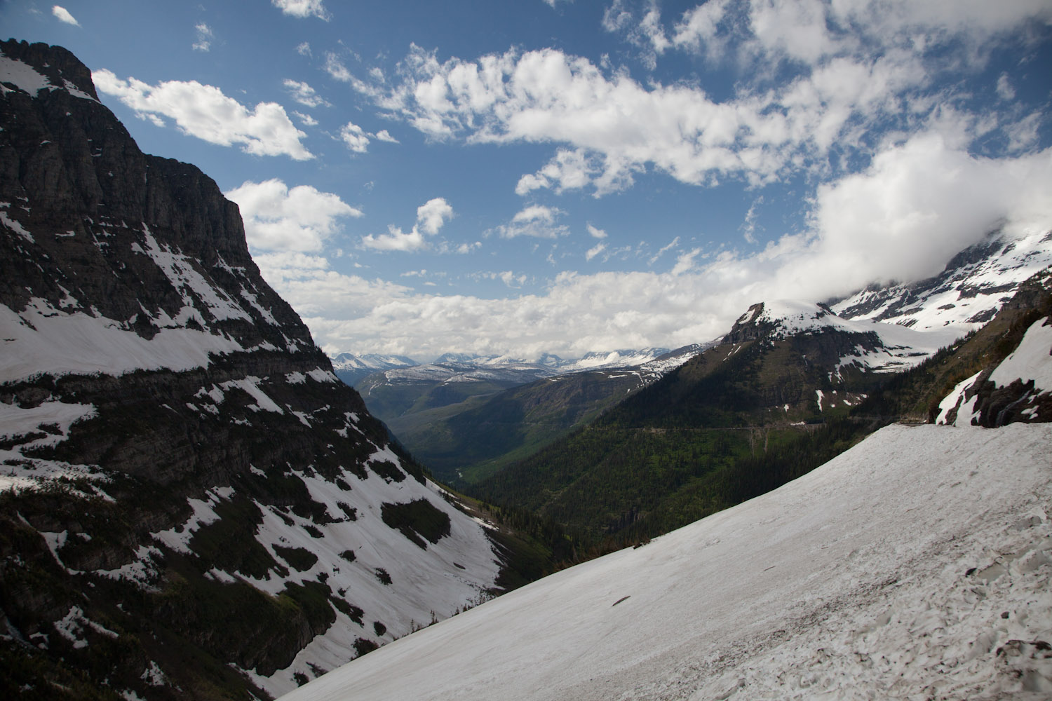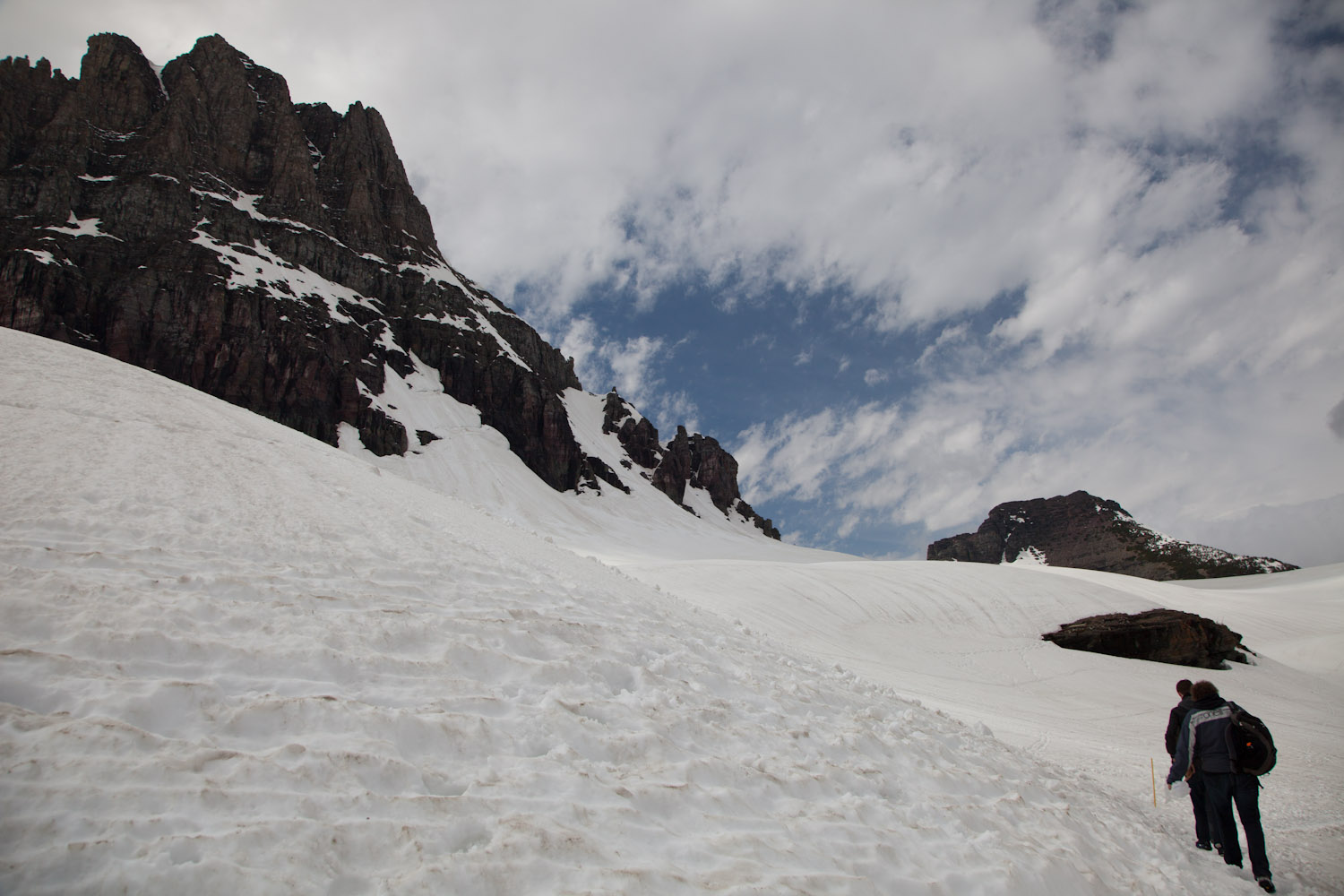 En dan reden we via de Going To The Sun Road richting Hidden Lake. Die weg is sinds eergisteren open voor verkeer en vrijgemaakt van alle sneeuw, en dat voor het eerst sinds dit jaar! Da is weer ideaal gepland van Coppens. Vooraleer naar Hidden Lake te gaan, aten we eerst nog ons zot middagmaal. En dan volgde de wandeling richting het Hidden Lake. Slechts 4,8km (heen en terug), maar twas er wel een op sneeuw, waardoor het maar traag vooruit ging.
