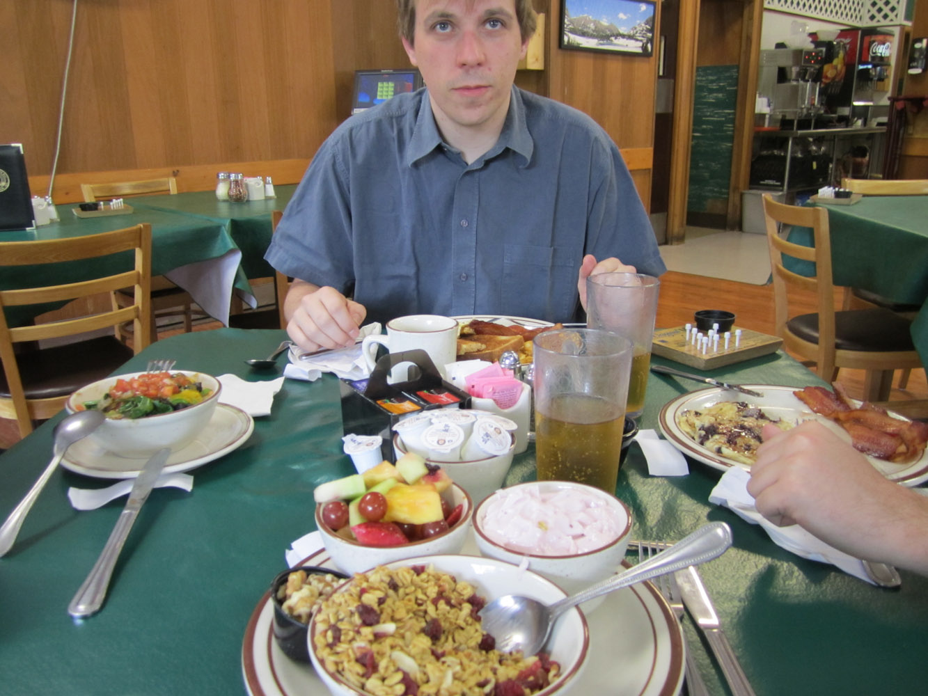 De bbq smaakt wel na het middageten van vandaag: twas doritos met cheddar-dipsaus, beetje Frosties en nen ‘powerbar’ met bosvruchten. Twas al dat we bijhadden in de koffer en eten verkochten ze nergens in de buurt. Ma kzal anders beginnen bij het begin van de dag. Dus, ontbijt. Ja, ontbijt. Da was in een kot dat hoorde bij onze slaapplaats. Voor net geen 40 flappen hadden we daar toch nog een redelijk deftig ontbijt (zie foto). Kheb zelfs een deel van mijn Granola aan Pieter gegeven wegens te veel. Zo was die ook direct content.