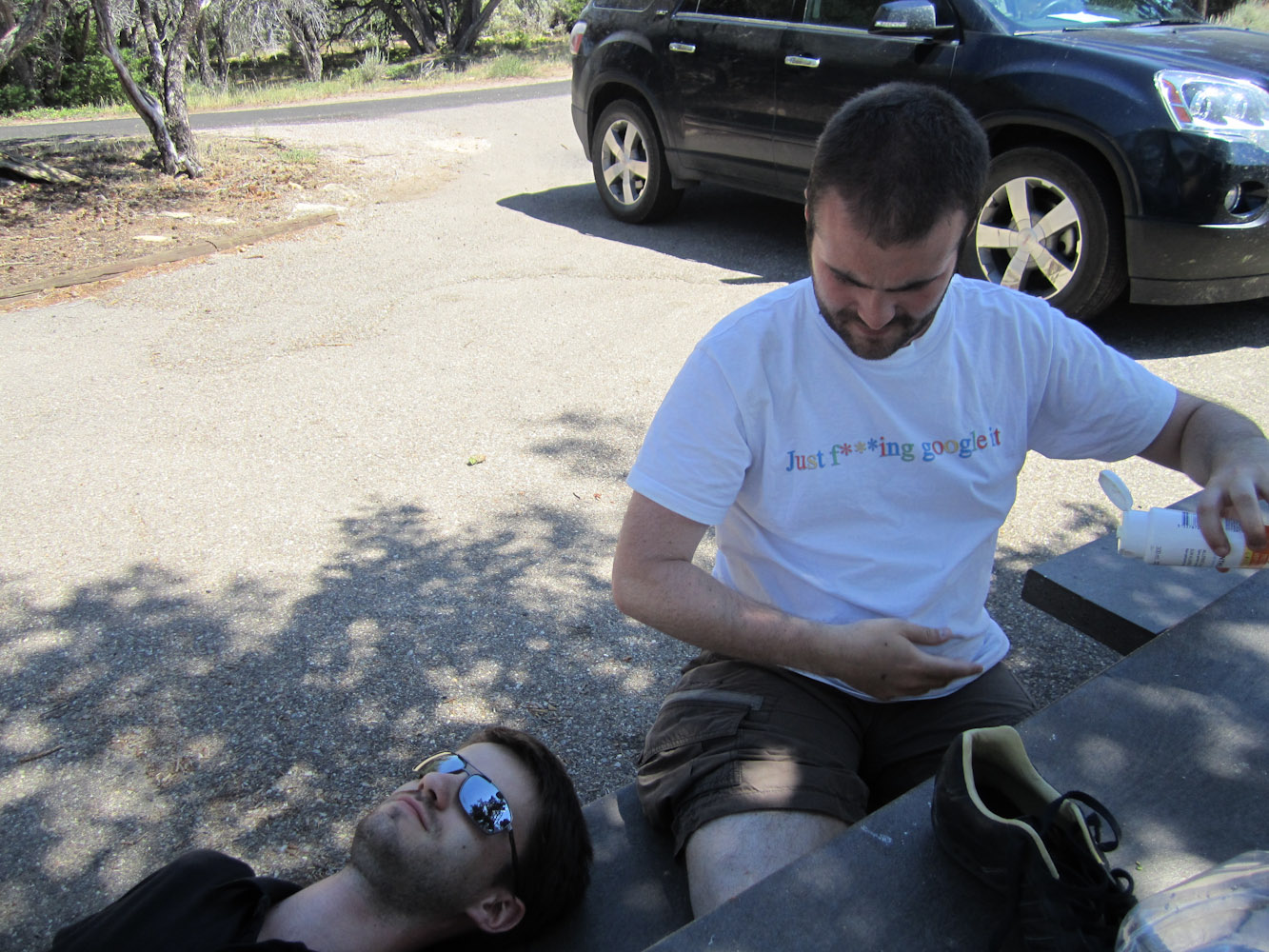 Omdat brunchen niets voor ons is, was het hierna al meteen weer tijd voor de lunch. Droog brood dus. Maar in combo met de humus van een paar dagen geleden (die de frigobox al een mooie geur heeft meegegeven) en voor Koen in combo met een halve pot aardbeienconfituur, was het toch nog iet of wat eetbaar. En uiteraard een schelleke cake om het af te ronden. Alleen jammer dat er slechts 10km verder een wandeling op het programma stond.