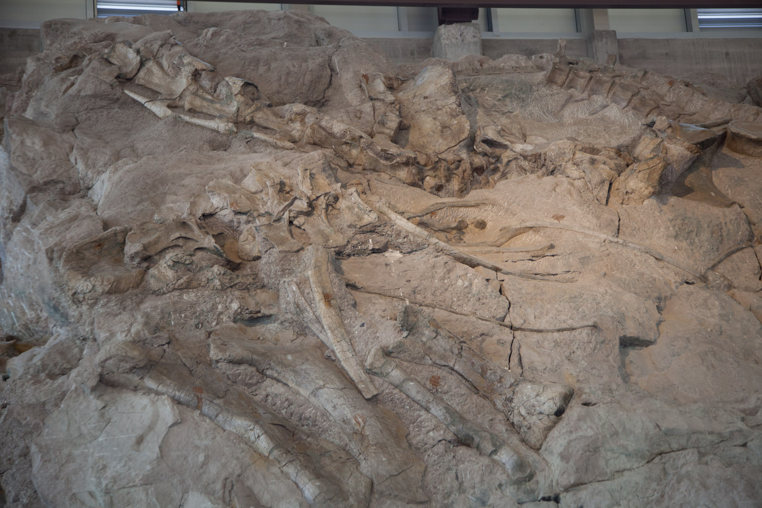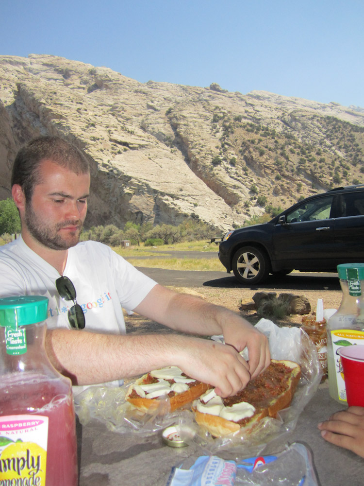 Dan maar richting Wal*Mart. De belegde broodjes zijn veel droger dan die van de Safeway, maar voor de rest blijft het toch een toffe winkel. En ge kunt niet voortgaan zonder wa schellekes cake of een chocoladetaartje. Voor 4$ kunt ge dat toch niet laten liggen eh? Allé vooruit, twerd dus een laat ontbijt dichtbij Dinosaur National Monument, waarna we dan dinosaurus-beenderen van pakweg 150 miljoen jaar oud konden bezichtigen in Fossil Quary. Wel eens tof om te zien. Zeker als ge weet dat het zo gigantisch oud is.