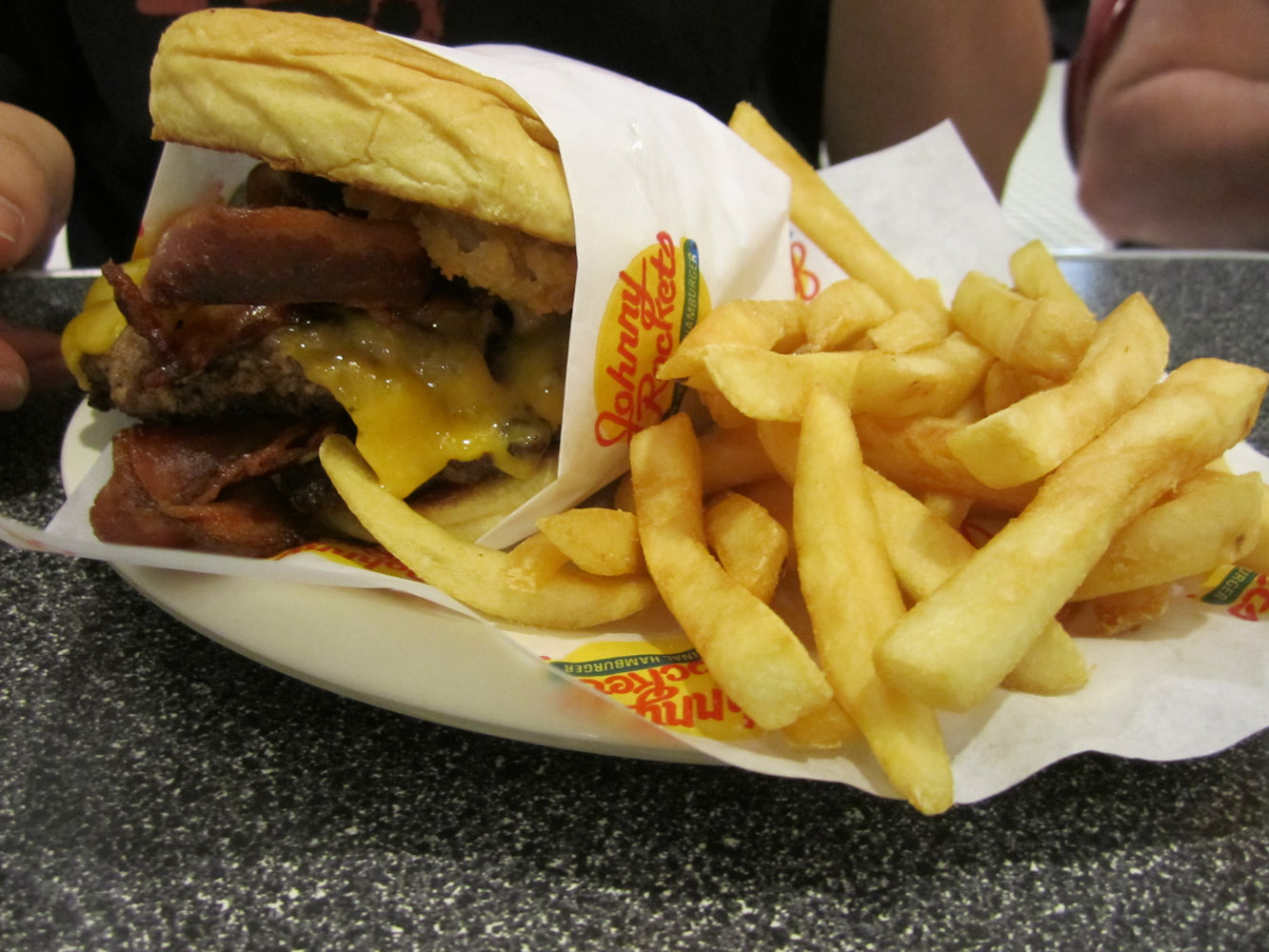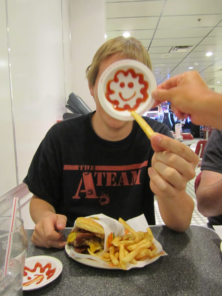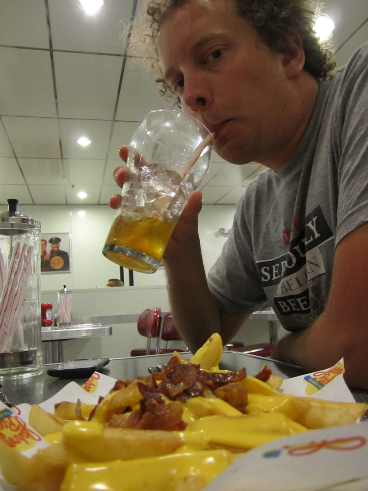 De afdaling ging gelukkig een pak sneller en 2,5u en een verfrissende en bekkentoeplakkende Mountain Dew later, vertrokken we richting een Johnny Rockets Restaurant in Albuquerque. Twas uiteindelijk 17u toen we ons middagmaal konden bestellen, dus dat werd ook meteen ons avondmaal. We kozen allemaal voor een Double Smoke House hamburger met cheese fries met bacon. Wat een combo! Met 1000kcal voor de burger alleen volstond dit wel qua avondmaal. En aangezien deze Johnny Rockets zich in het Route 66 Casino bevond, hebben we al eens op de slotmachines geoefend tegen dat we in Las Vegas zijn. Efkes stonden we in de plus, maar we zijn blijven gaan tot we elk 1 dollar hadden verspeeld. In Vegas gaat het beter moeten lukken.
