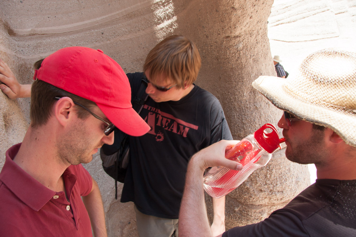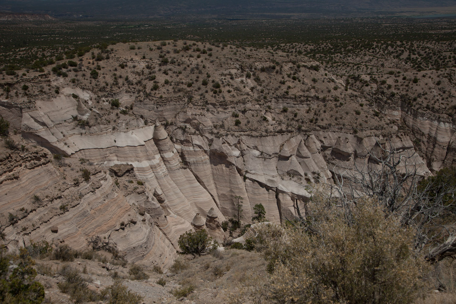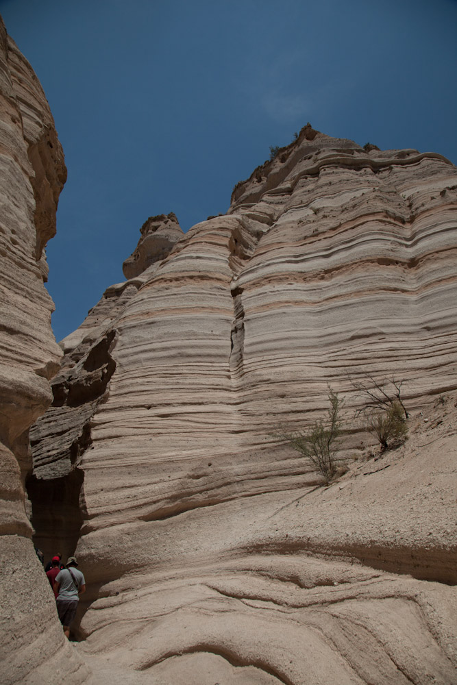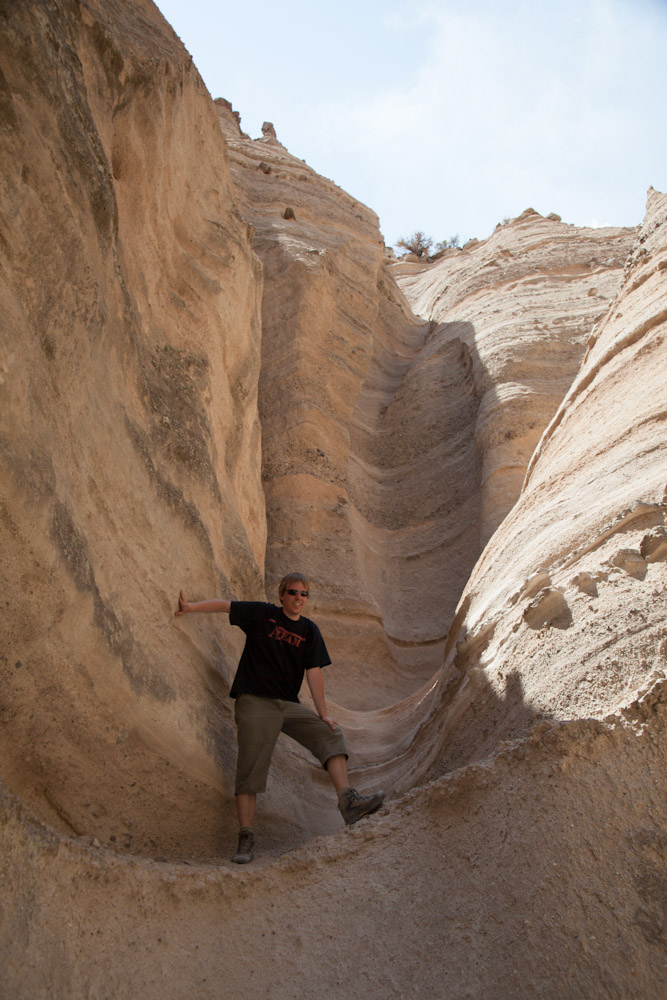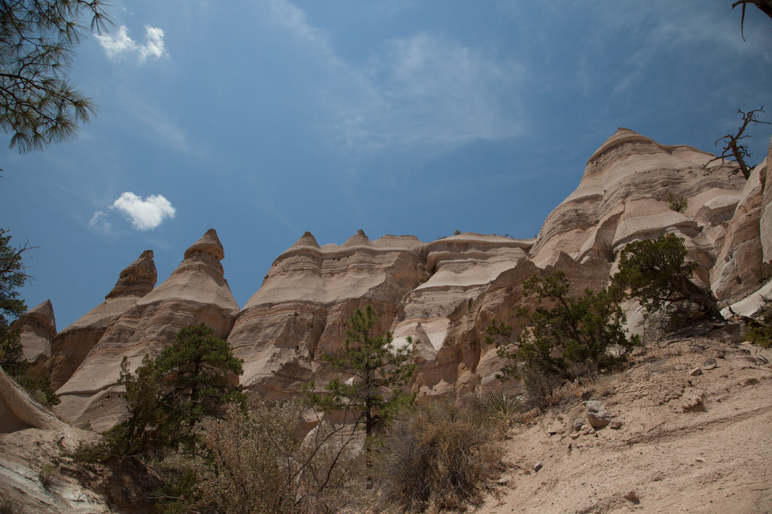 Omdat we gisteren al hadden aangetoond dat we zo’n fantastische wandelaars zijn, maakten we het ons vandaag nog een beetje lastiger. Gepakt met 4 liter water en met ons buikje goed vol van ons laat ontbijt, vertrokken we zowat pal op de middag aan onze wandeling in Tent Rocks National Monument. Dan hebben we immers geen last van mogelijks ochtenddauw, en ook onze schaduwen lopen dan het minst in de weg. Wij denken ook aan alles eh!