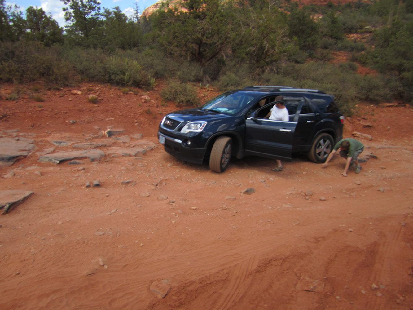 Om tot aan het begin van de Devil’s Garden wandeling te geraken, moesten we wel een offroad-baantje overbruggen. Vorig jaar hebben we dit moeten cancellen, wegens onze kak-auto. Nu lieten we ons niet meer kennen, en met onze all-wheel-drive als heiligmakend middel, waagden we onze kans. Plots verstonden we wel waarom er buggy’s verhuurd werden in de buurt. Maar op het gemak en met af en toe uitstappen om te controleren of we wel over de stenen konden, geraakten we er uiteindelijk. Die paar krasjes op de auto zijn maar details. Alles (behalve onderkant auto) is omnium verzekerd zonder franchise, dus no problemo. En net voor afgifte van de auto zullen we het wel wegwerken met een Mountain Dew en een stofwegeltje.